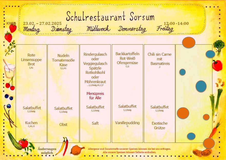 Schon ab Klasse 5 helfen Montags bis Donnerstags die Schülerinnen und Schüler bei der Zubereitung der Mahlzeiten. So kann leicht ein selbstverständlicher Umgang mit Lebensmitteln und deren Verarbeitung vermittelt werden. Die Schülerinnen und Schüler tun etwas für die Gemeinschaft- alle ziehen an einem Strang, damit wir täglich gut und ausgewogen essen können und Schule somit nicht nur Lern- sondern auch Lebensraum wird.